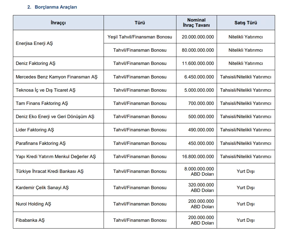 SPK yayınladığı bültende 13 şirketin borçlanma aracı ihraçlarına onay verdi. Borçlanma aracı ihraçları, şirketlerin nakit ihtiyacını karşılayabilmek için sıklıkla başvurdukları bir yöntemdir. Özellikle krediye erişimin zor ve pahalı olduğu günümüzde şirketler, daha düşük maliyetle bono/tahvil gibi borçlanma araçları ihraç ederek nakit ihtiyaçlarını daha ucuza mâl etmeye çalışır. Bu tür uygulamalar şirketin nakit akışının devamlılığı adına önem arz eder. Onay alan şirketler arasında Enerjisa Enerji A.Ş. (ENJSA), Teknosa İç ve Dış Ticaret A.Ş. (TKNSA) gibi halka açık şirketler de yer aldı. Bu akşam onaylanan borçlanma araçları şu şekilde;